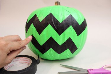 For the chevron pattern, select duck, masking or electrical tape that is about one inch thick, as the narrower tape will be easier to work with. Cut small sections of tape and piece them together to make a row of zig zags. Pumpkins have grooves and irregular shapes, so there is no possible way for your chevron pattern to be perfect as it goes around the pumpkin. Make peace with this fact, and it will save you much frustration.